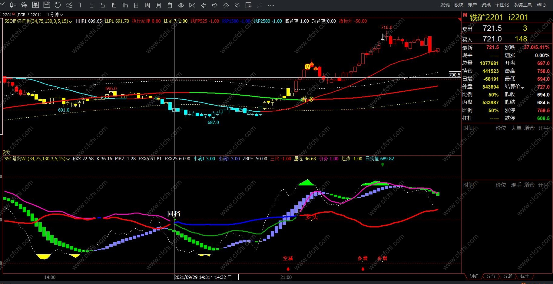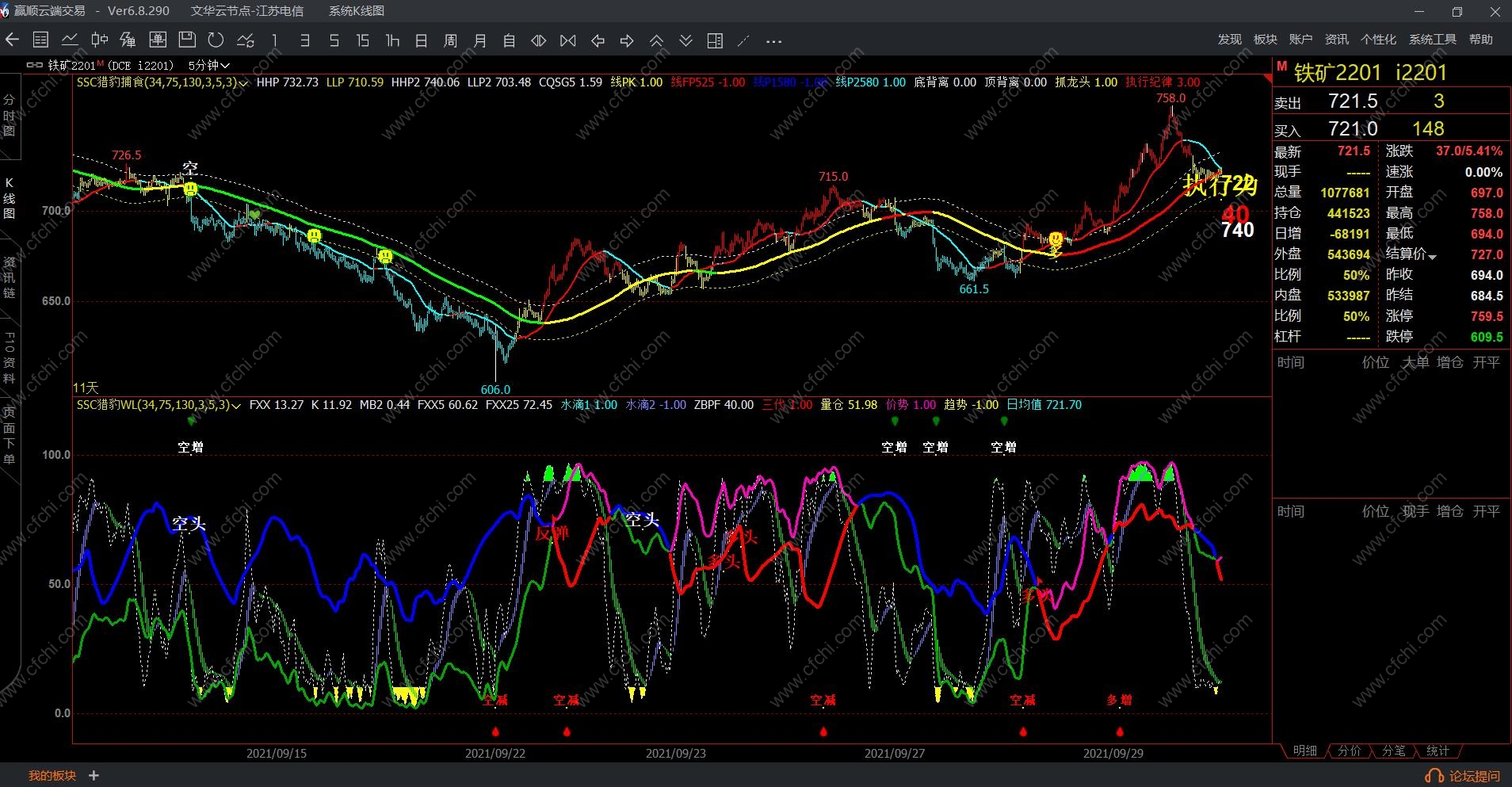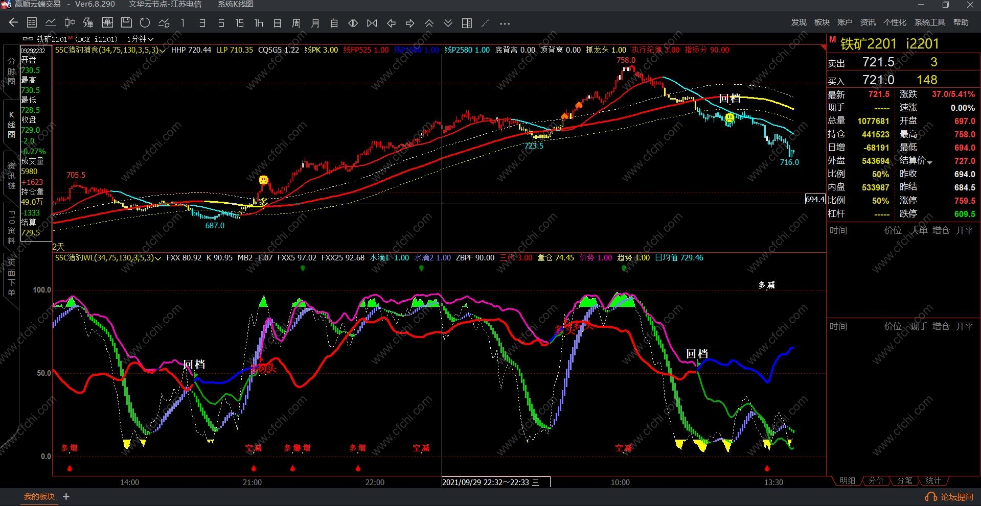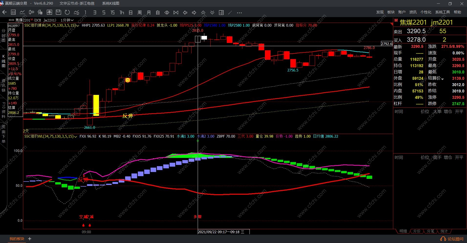 1、WL指标:由于量化指标集中了短期、中期、成交持仓计算方式类型。所以同时出现信号准确率高,但存在测不准,上述有说过,WL指标像整条鱼,是做盘方向,那么想吃整条鱼交叉就做行吗,很多交叉点存在着主力洗盘动作,拉上去马上下来,未来又不确定,所以不看分按照这个交叉点不行的,交叉同时指标分在60分以上才可以。想稳定赚钱,就需要80分了,就吃鱼身。回档和反弹交叉信号尽量不做单,若需做单按照短线原则有赢就跑。