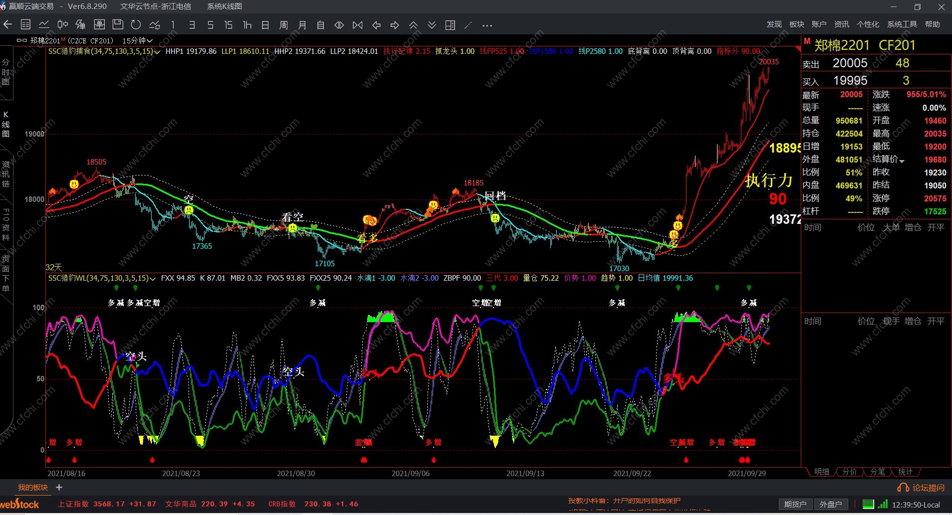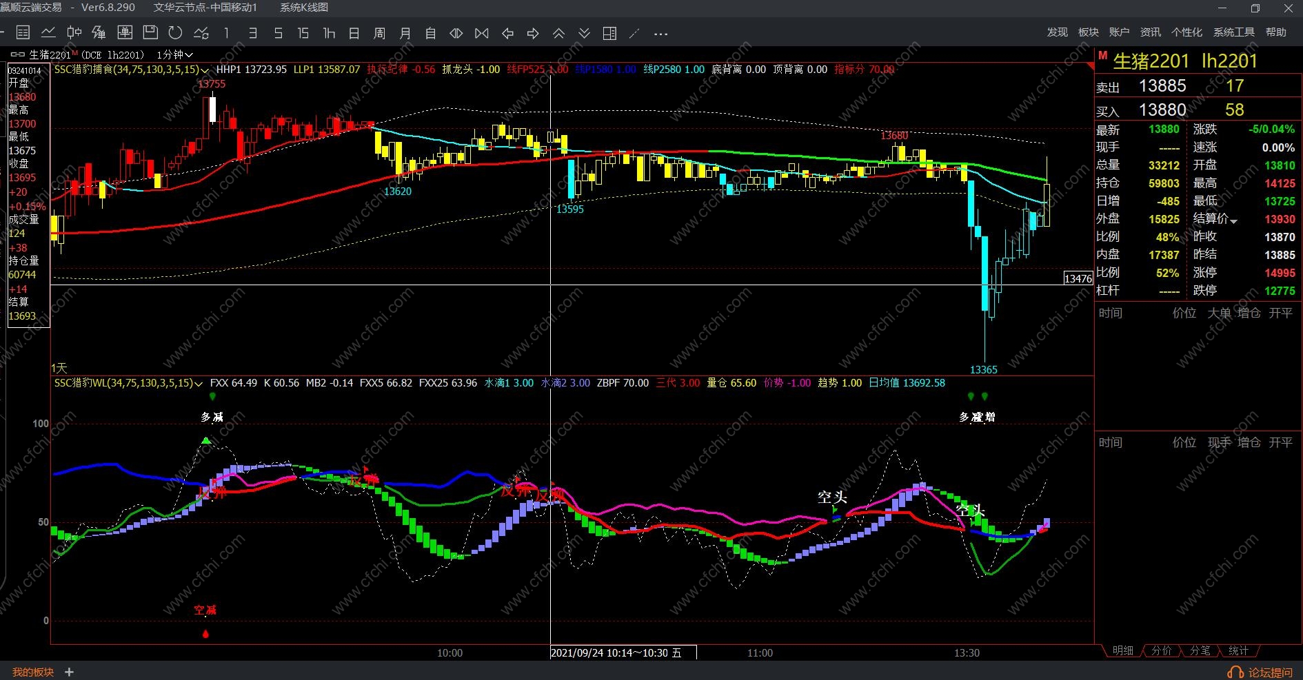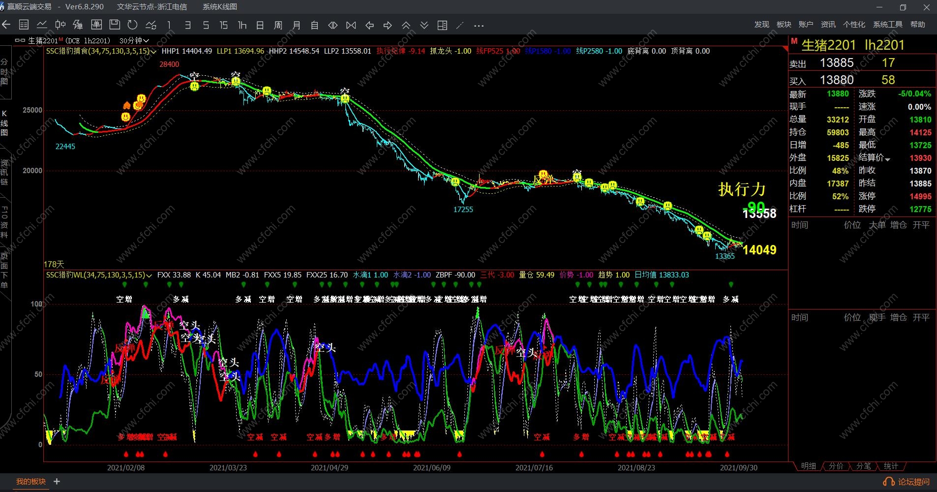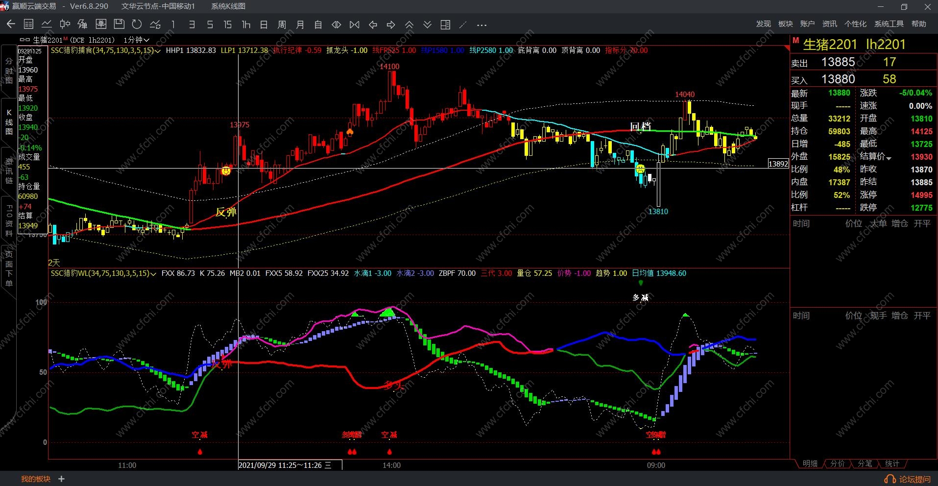 1、WL指标:由于量化指标集中了短期、中期、成交持仓计算方式类型。所以同时出现信号准确率高,但存在测不准,上述有说过,WL指标像整条鱼,是做盘方向,那么想吃整条鱼交叉就做行吗,很多交叉点存在着主力洗盘动作,拉上去马上下来,未来又不确定,所以不看分按照这个交叉点不行的,交叉同时指标分在60分以上才可以。想稳定赚钱,就需要80分了,就吃鱼身。回档和反弹交叉信号尽量不做单,若需做单按照短线原则有赢就跑。