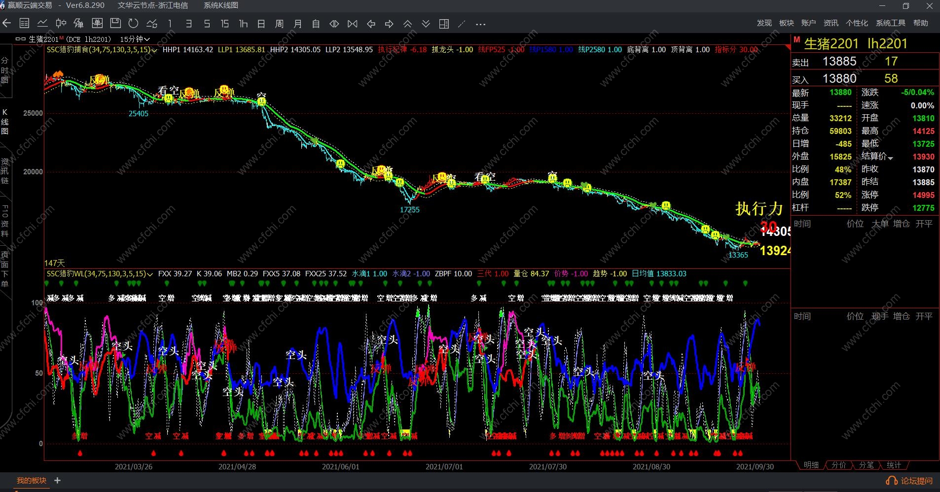 1、指标类型:现在使用级的指标基于文华财金软件有猎豹捕食(BS)、猎豹WL(WL)两个量化指标。猎豹捕食图形有震荡通道、短期移动止损止盈线(平仓线)、中期移动止损止盈线(平仓线)、四色价格K线、多空信号点和平仓点。猎豹WL指标有MACD改进型线(KD线)、仓量线、短期线、方向点、超买超卖、成交量放大点。两种指标可以用于5分钟、15分钟吗?可以的。我们量化指标适合期货各种周期及各种品种(包括股票和各种投资类)。