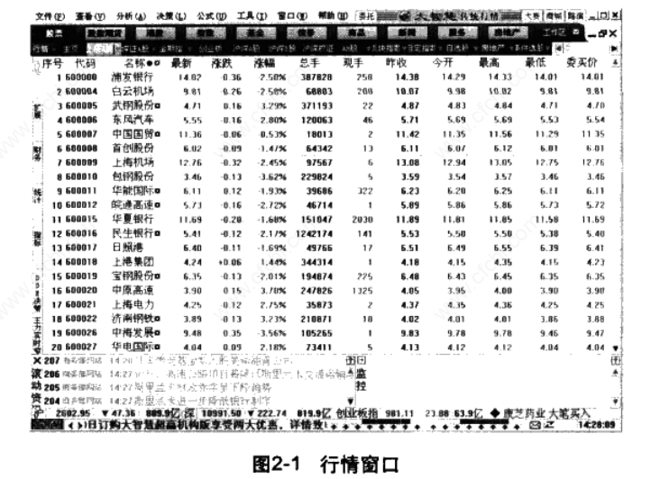 行情窗口看盘比较简单,只要明日那些双据的⒆含太就与乐未’比如:现价、涨幅、日涨跌、开盘、收盘、最高价、最低价、成父重、风空金o、$-15与元安头、成交笔数、每笔手数等,这些在第1章中都有介绍,这里不再赞述。行情窗口如图2-1所示。