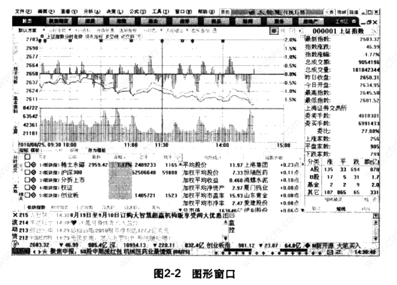图形窗口不仅显示有交易信息数据,还有走势图形,使投资分析更加形象。用户应该先学习形态分析和均线分析的基础知识,然后在日常交易的过程中,不断对照分析,摸索规律,时间长了,就能看明白图形背后的真实含义了。图形窗口如图2-2所示。
