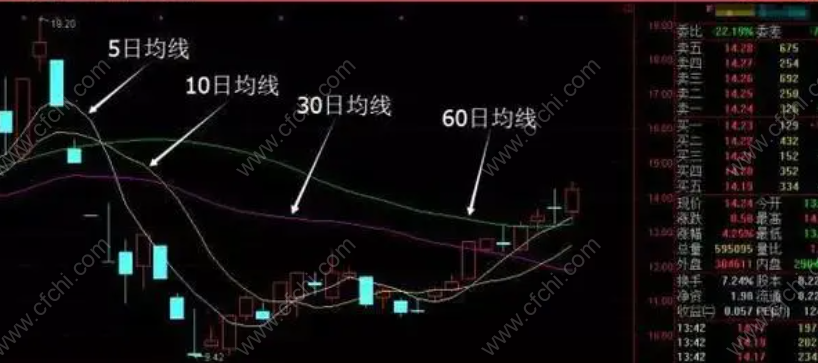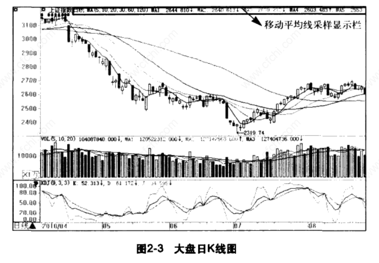 移动平均线分别用不同的颜色表示。如图2-3中所示的6条移动平均线分别是5日、10日.20日、30日、60日和120日的移动平均线,表示颜色在“移动平均线采样显示栏”有明确提示,其中时间最短的5日均线用蓝色表示,10日均线用紫色表示,20日均线用灰色表示,30日均线用棕色表示,60日均线用绿色表示,120日均线用浅蓝色表示。