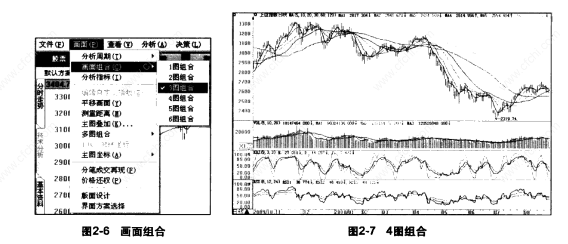 在K线窗口的菜单栏中,选择“画面”→“画面组合”命令,将弹出如图2-6所示的子菜单,从中可以选择6种图形组合,这里选择“4图组合”,大盘K线窗口将在原来的3个子窗口中增加一个窗口,显示RSI指标,如图2-7所示。