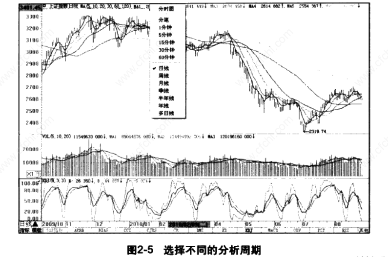 在默认情况下,K线图的分析周期按日线显示,即每-一根K线表示一个交易日的情况。如果需要分析其他周期,可以在K线窗口中单r优上兴r “o弹出的菜单中选择不同的分析周期,如图2-5所示。