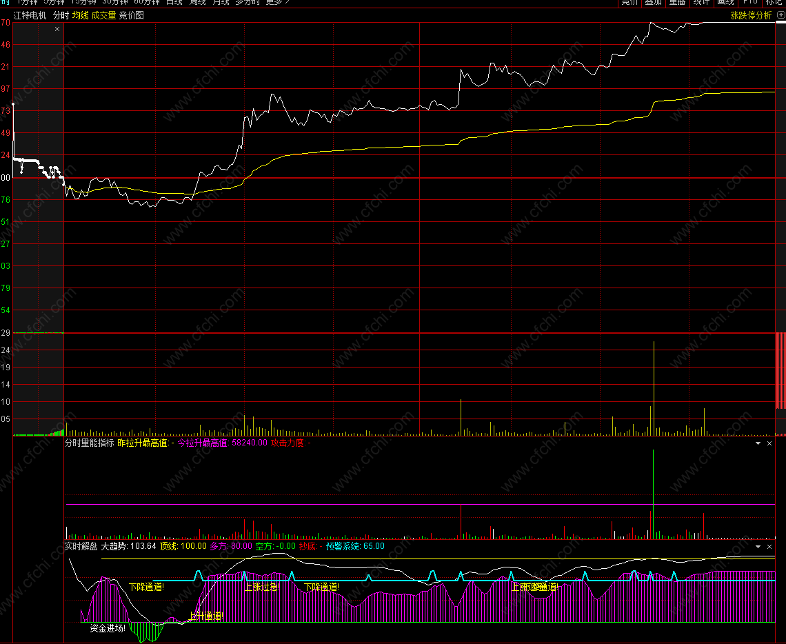 ( 3)黄色柱线:在红白曲线图下方,用来表示每一分钟的成交量。( 4)成交明细:在盘面的右下方,动态显示每笔交易的价格和手数。