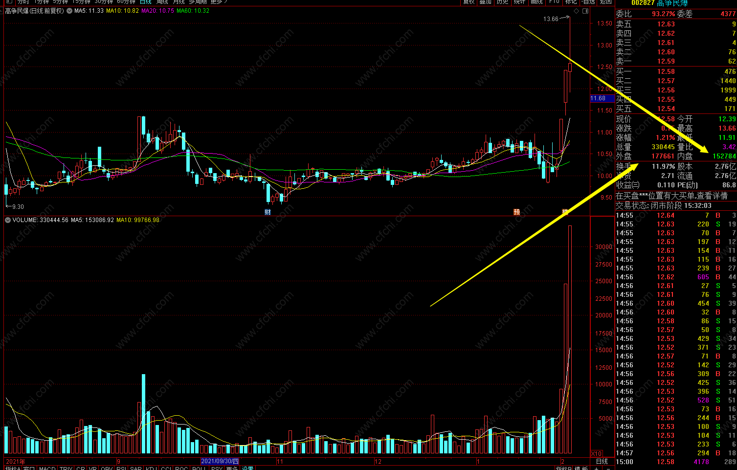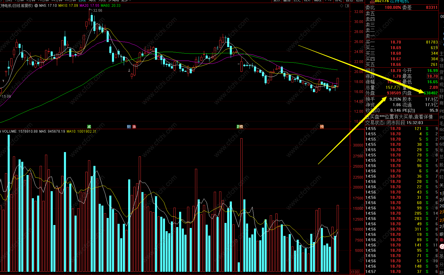 (7)当股价处于低位的上升初期或主升期,外盘大于内盘,则是大资金进场买入的表现。(8)当股价处于高位的上升末期,外盘小于内盘,则是大资金离场卖出的表现。