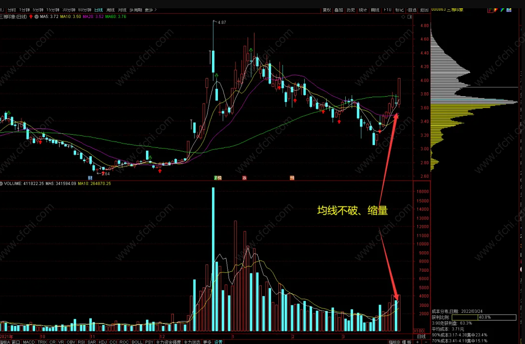 (2)下跌时成交量无法持续放大,在重要支撑位会缩量盘稳,而上升途中成交缓缓放大。