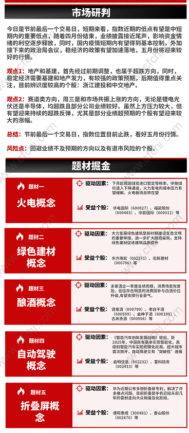 早上好今日是节前最后一个交易日,短期来看,指数近期的低点有望是中短期内的重要低点,随着四月份结束,业绩披露接近尾声,影响资金情绪的利空逐步释放,同时,国内疫情短期内有望得到基本控制,外加接下来的政治局会议,稳经济的政策有望加速落地,五月份将迎来较好的行情。