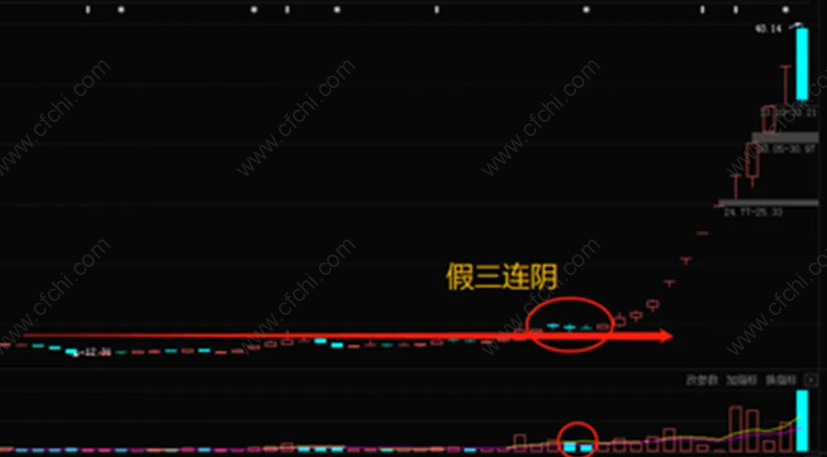 第四,成交量配合良好,三连阴最好伴大成交量,经典图形是"倒拨垂杨柳″!
