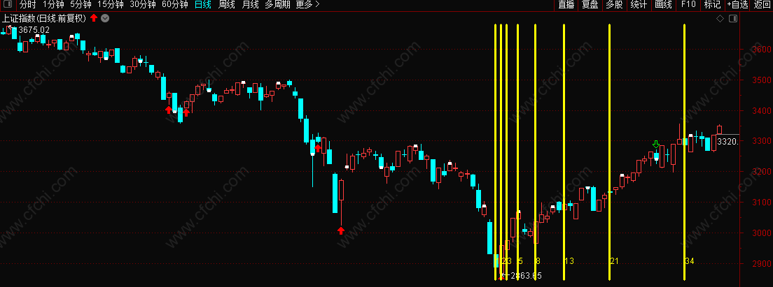 由于时间转折周期规律频繁地发生作用,所以对于一些落在斐波那契周期线上的日期都应该特别注意,如5天、8天、13天、21,天、34天、55天等。投资者每隔一段时间就要考虑时间转折的可能性。