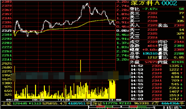 分时价位线(白色曲线)表示该只 股票的分时成交价格。