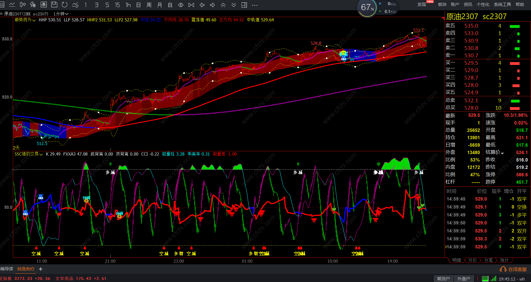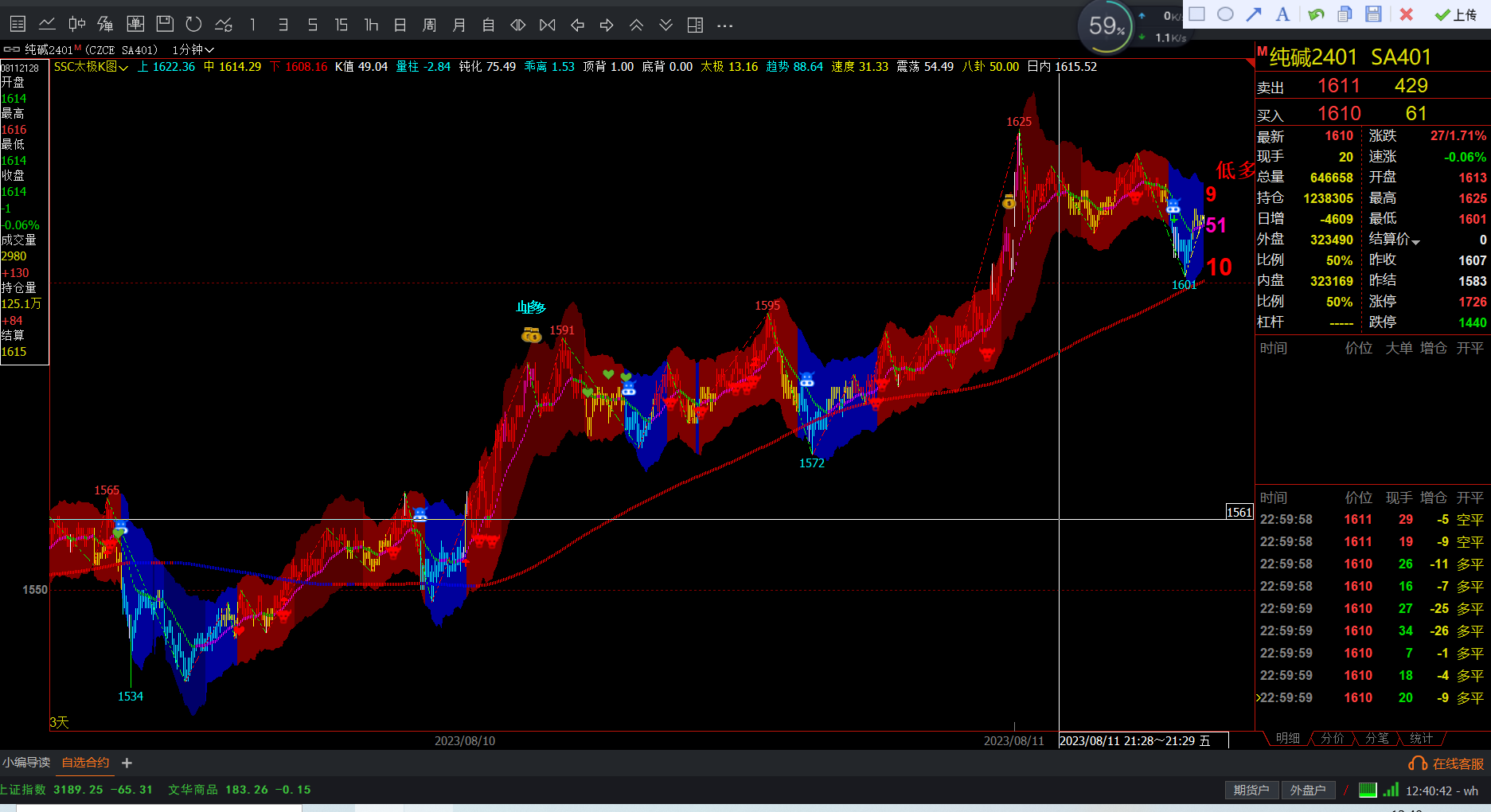 开盘后观察那类产品进入单边市,同时需要抓该类产品的龙头、趋势线比较陡峭的产品,趋势值越高就越陡峭,虽然是单边市,若不陡峭,价格会在中轨上下震荡。交易系统右边最上数字代表的是涨跌速度及趋势值,值越高代表越陡峭。
