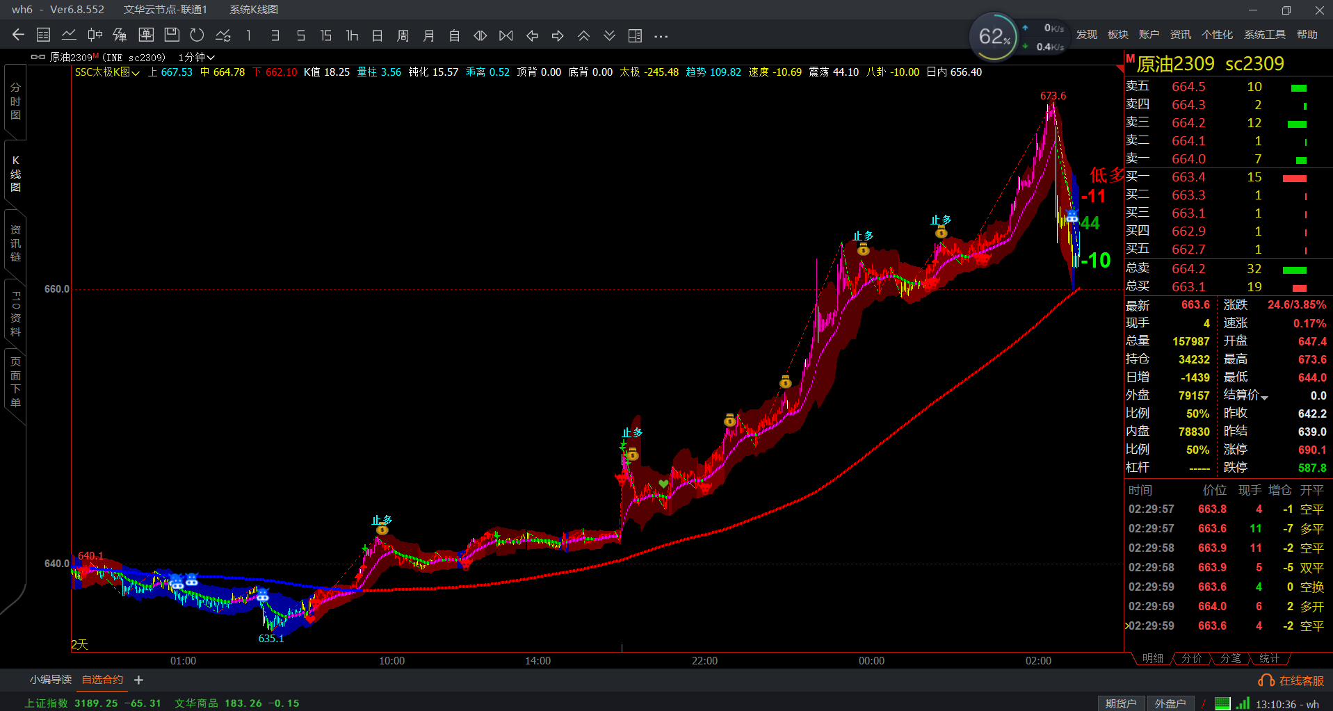 交易时机:主图的趋势线提供了方向,太极通道提供了操作空间,卦相(信号分)就是进出场时机位置。或者卦相50多单、卦相-50空单。当然可以配合结构、PINGBAR、黄金分割和波浪理论其他功能。