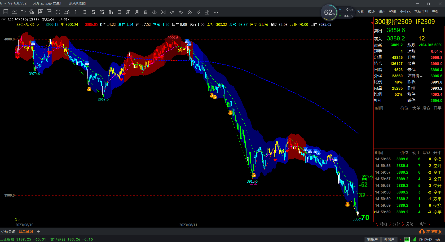 单边市以顺势而为原则为主,震荡市(原则上趋势线在太极通道内就是震荡市)以物极则反原则为主、利用好太极通道。交易系统已经提示是八挂做单还是轨道做单,一目了然。顺势而为看卦相和结构,物极则反看轨道。所以看盘先判断四象,太阳太阴势看八卦,少阳少阴势看太极轨道。少阳少阴势行情空间利润少,尽量找太阳太阴势产品做单。