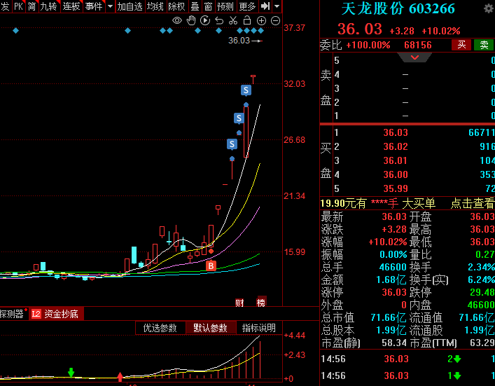 一阴一阳之谓道及太极,太极生两仪也就是阴阳、两仪生四象也就是太阳、少阳、太阴、少阴,四象生八卦,就是八个卦相,这里就是K线的信号分(卦相分八种;70、50、30、10、-10、-30、-50、-70),少阳和少阴就是震荡市,太阳和太阴就是单边市。主图太极通道内涵这四种K线形态,每个K线都有一种八卦相,太阳就是阳K阳势,太阴就是阴K阴势,少阳就是阳势黄K或阴势阳K,少阴就是阴势黄K或阳势阴K。太阳做单就是逢低多,太阴做单就是逢高空。少阴和少阳做短单,高空低多。高就是上极点,低就是下极点。