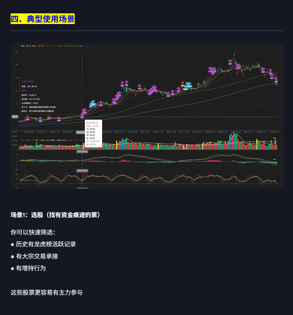 在做复盘和分析过程中,我们每天都会接触大量信息,比如龙虎榜、解禁、股东增减持、大宗交易,这些信息都很重要,但有一个致命问题:它们是分散的,你需要在多个页面进行切换,靠记忆去对比股价位置,效率过分低下。