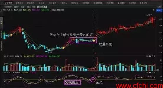 1、当股价在低位徘徊很长一段时间后,kdj曲线也徘徊在中位(50附近),kdj中的j线与k线同时向上突破d线,形成金叉,此时成交量也在放大,说明短期股价将上涨,投资者可大胆买进个股。