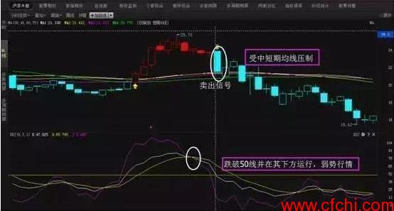 4、当KDJ曲线向下突破50以后,并且KDJ曲线在50以下区域运行,说明股价处于下跌趋势,这是KDJ指标发出的持币待涨信号,若是股价同时被中短期均线压制下行,此时投资者应该及时离场观望。
