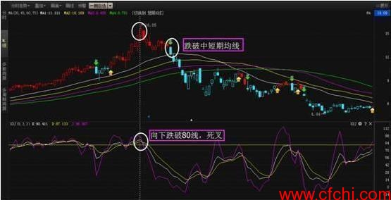 3、股价前期出现很大涨幅,随后下调,J线和K线在高位(80附近)几乎同时向下突破D线形成死叉,股价也同时跌破中短期均线,说明股价将转为弱势,后期将出现下跌行情,80附近的高位死叉,投资者应及时离场。