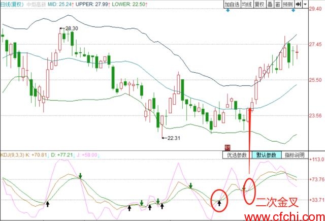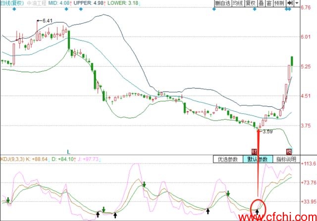 此时KDJ指标出现低位金叉形态,且交叉点位于20线附近,金叉的含金量极高。当股价突破中轨线时是最佳买入时机,随后突破上轨线是第二个买入时机。