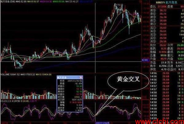 当股价经过一段很长时间的低位盘整行情,并且K、D、J三线都处于50线以下时,一旦J线和K线几乎同时向上突破D线时,表明股市即将 转强,股价跌势已经结束,将止跌朝上,可以开始买进股票,进行中长线建仓。这是KDJ指标“黄金交叉”的一种形式。