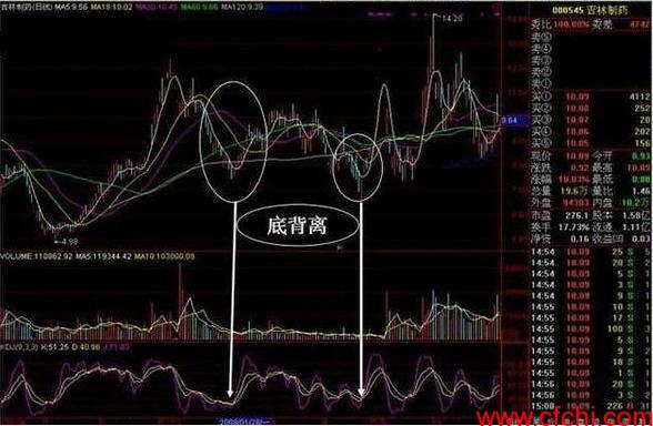 底背离一般出现在股价的低位区。当股价K线图上的股票走势,股价还在下跌,而MACD指标图形上的由绿柱构成的图形的走势是一底比一底高,即当股价的低点比 前一次低点底,而指标的低点却比前一次的低点高,这叫底背离现象。底背离现象一般是预示股价在低位可能反转向上的信号,表明股价短期内可能反弹向上,是短期买入股票的信号。