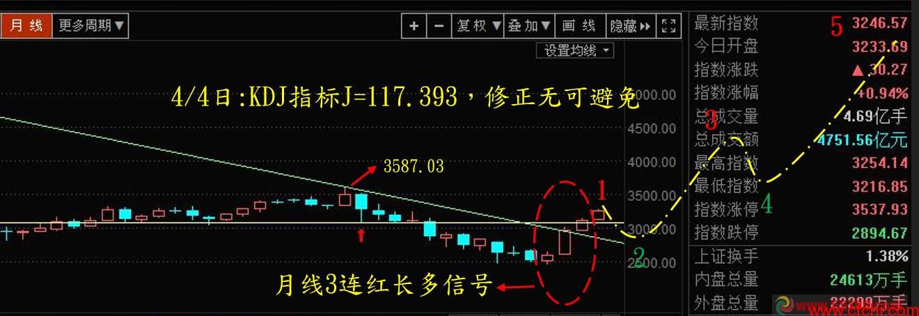 (4)以波浪转折定义尚末突破前高(3587.03)根本没有空转多,月线只能视为反弹(逃命波)。