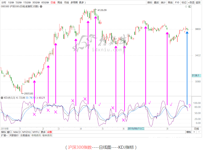上图中是沪深300指数最近一段走势的日线图,上面标出了绝大部分的KDJ死叉和股价对应的位置。总共标记了10个KDJ死叉,但成功下跌的只有3次,剩下7次都以失败告终。为什么会这样?因为这段沪深300指数的前半段是一波上涨行情,除了最后一次KDJ死叉后股价下跌外,其余情况要么不跌,要么上涨。