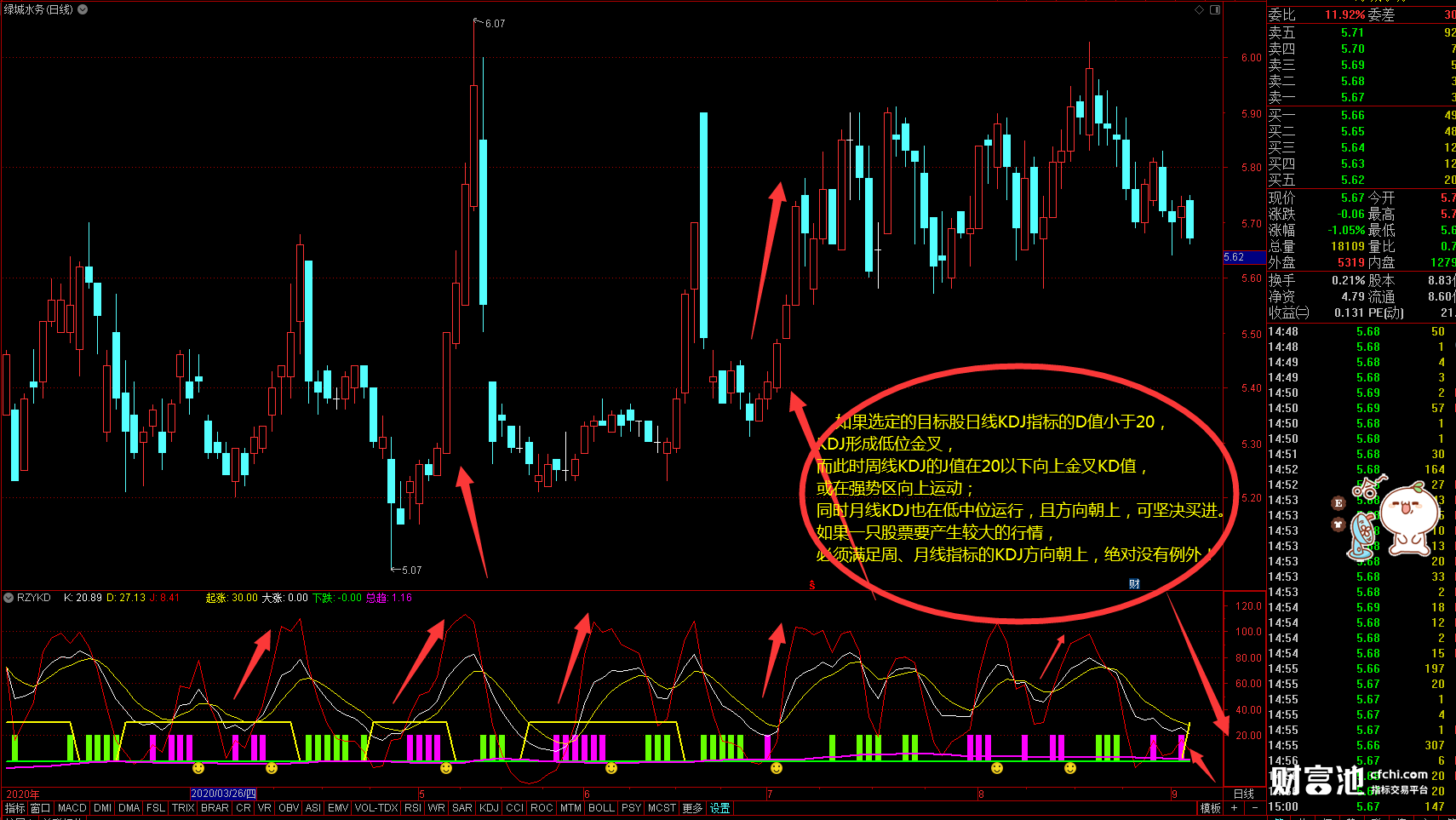 如果选定的目标股日线KDJ指标的D值小于20,KDJ形成低位金叉,而此时周线KDJ的J值在20以下向上金叉KD值,或在强势区向上运动;同时月线KDJ也在低中位运行,且方向朝上,可坚决买进。如果一只股票要产生较大的行情,必须满足周、月线指标的KDJ方向朝上,绝对没有例外!
