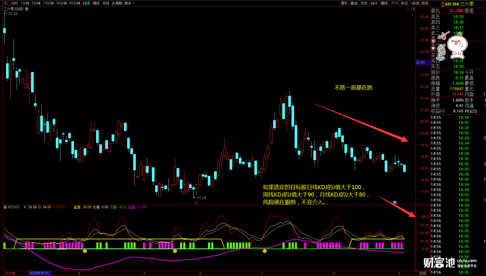 炒股看一下周、月线十分有必要,很多时候,周、月线已经死叉下行,中长线趋势走坏,但日线偏偏发出金叉,K线也走好,量价配合也好,而此时介入,多数情况下就是中、短期头部。下面就KDJ指标在日、周、月线中的不同表现谈一下自己的看法。(注意:适用范围为你选定的目标股)