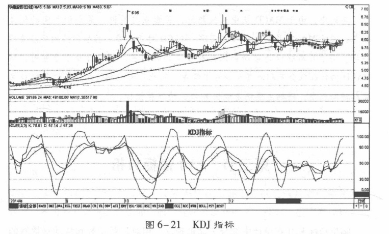 KDJ指标由3根曲线组成(图6-21),移动速度最快的是J线,其次是K线,最慢的是D线,它们的变化范围都在0~100之间。其实J的取值可以大于100,也可以小于0,但为了便于图形的绘制,当J值大于100时,仍按100绘制;当J值小于0时,仍按О绘制,所以在KDJ指标图形中可以看到J值在0或100处呈直线状。