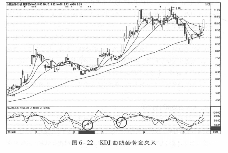 当股价经过一段很长时间的低位盘整行情,并且K、D、J三线都处于50以下时,一旦J线和K线同时向上突破D线,表明股市即将转强,股价跌势已经结束,将止跌向上,投资者可以开始买进股票,进行中长线建仓(图6-22)。这是KDJ指标黄金交叉的一种形式。
