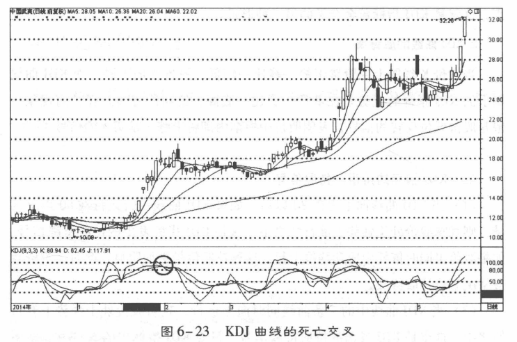当股价经过前期一段很长时间的上升行情后,股价涨幅已经很大的情况下,一旦J线和K线在高位(80以上)几乎同时向下突破D线时,表明股市即将由强势转为弱势,股价将大跌,这时应卖出大部分股票而不能买股票(图6-23),这就是 KDJ指标的死亡交叉的一种形式。