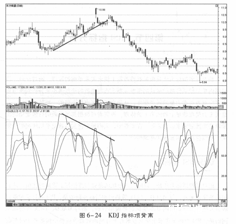 当K线图上的股价走势一峰比一峰高,股价在一直向上涨,而KDJ曲线图上的KDJ指标的走势是在高位一峰比一峰低,这叫顶背离。顶背离现象一般是股价将高位反转的信号,表明股价中短期内即将下跌,是卖出信号(图6-24)。