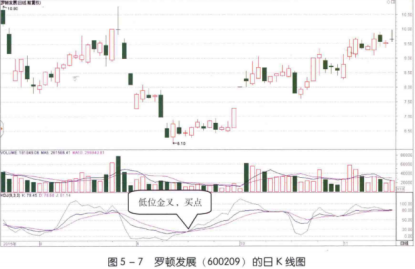 如图5-7所示,2015 年9月21日,当罗顿发展(600209) 股价见底反弹时,其KDJ指标中的指标线K和指标线D在20以下的低位完成了金叉形态。这样的形态说明股价在短期内的上涨动能逐渐增强,是看涨买入信号。当金叉形态完成时,投资者可以积极买入股票。