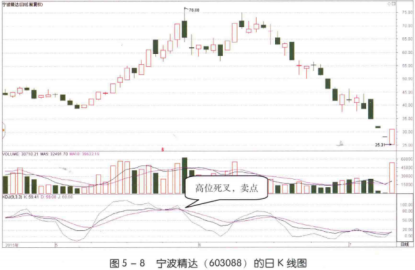 如图5年-8所示,2015年5月28日,当宁波精达(603088) 股价见顶下跌时,其KDJ指标在80以上的高位完成了死叉形态。这样的形态说明市场上的多方力量越来越弱,空方力量增强,此时股价已经有了见顶下跌的迹象,并且未来可能会持续下跌。此时投资者应该尽快将手中的股票卖出,回避风险。