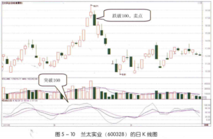 如图5-10所示,2015年8月至10月,兰太实业(600328) 股价经过快速上涨后,其KDJ指标中的指标线J突破100。这样的形态说明股价经过短期的快速上涨后,多方力量已经极度强势,但是有盛极而衰的风险,此时投资者应该注意股价见顶下跌的风险。