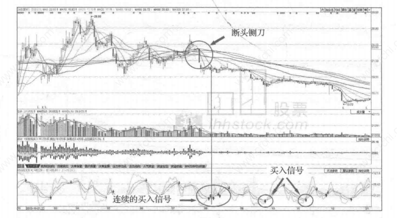 下图是300162雷曼股份2015年10月到2017年1月的股价走势图,在2016年7月27日在股价图形上出现了一根断头钏刀,而在之后的一周内KDJ连续发出买入信号。如果不看图形单看KDJ,那么应该买入,但是如果看了图形可能就知道断头钏刀之后该做什么了。而在股价下跌趋势中也有二次KDJ金叉买入信号。