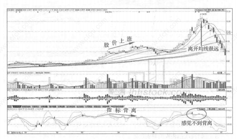 如果单单看KDJ指标的背离情况则将错失主升浪,而在真正的顶部,图形显示离60日均线乖离率相当大,是卖出的时机,但KDJ的背离情况却并不明显。如果等待明显的KDJ顶背离,那么,将带来不小的损失。