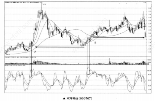 如下图所示的双环科技(000707)从图中A方框处看到,KDJ随着股价启动上涨行情而快速上冲,之后股价仍旧保持上升势头并连续创出新高,而KDJ却见到高点后逐波回落,和股价的上涨形成背离。