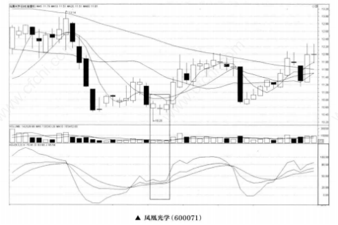 在如下图所示的凤凰光学(600071)也发生了KDF三线粘合的情况。但该股尚处于下跌初、中期,股价对市场资金不具有太大的吸引力,所以其上涨的爆发力有较大的欠缺。