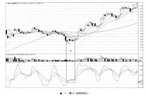 如下图所示的三一重工 (600031)投资者在实战中可能遇到过很多类似图中A方框处的KDI形状,股价创新低时KDJ出现底背离,KDF三线在股价盘整时处于粘合状态并不死叉和下跌随后股价迅速开始拉升。