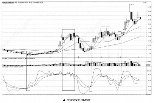 如下图所示的中国宝安(000009)图中方框处标示的是一些主要的买点和卖点,因为是月线上的KDJ指标,其波动不像日线那样频繁,对行情的指示作用准确率相对较高。月线多适用于来判断较长时期内的股价变化方向,一旦某种方向被确认,其维持的时间也相对较长。