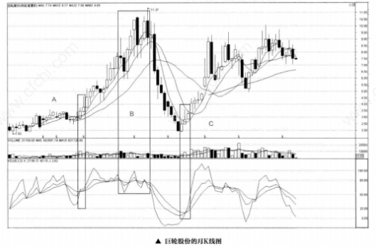 再如下图所示的巨轮股份(002031)的月线图KDI,图中A和C方框处KDJ金叉之后,股价都迎来了一轮翻倍以上的大行情,可见月线KDJ金叉的含金量相当之高。