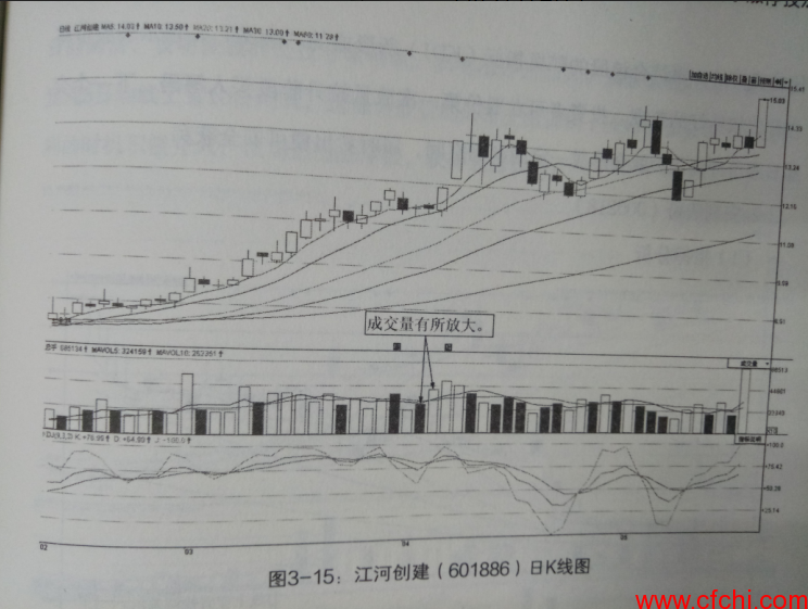 如图所示,在江河创建(601886)日K线图中,该股的随机指标(KDJ)所形成的“金叉”,表明该股后市短期内上涨的动力强劲。同时,该股的成交量也呈现出一种逐步放大的态势,表明该股的交投比较活跃。此时,投资者应该结合均线系统的支撑作用,积极寻找买点,选择时机获取筹码, 以期实现追涨获利的目标。