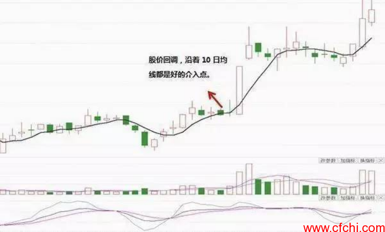 当股价的上涨趋势确立时,我们可以在股价出现回调,接近10日均线时买入,既沿10均线买入。