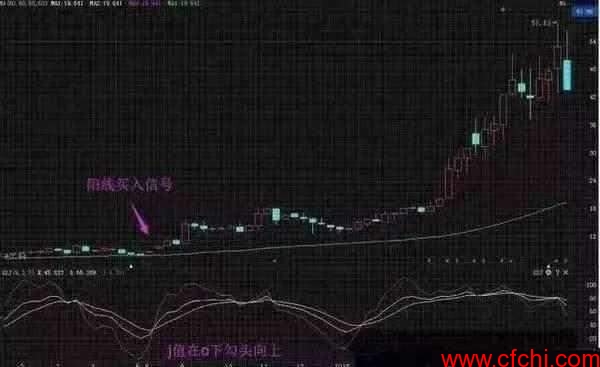 图中为周K线,K线回档到60周均线后,股价开始出现止跌回升的现象,J线拐头向上,若出现阳线,此时就是买入信号,投资者可以大胆买进,后期有大幅度上涨行情出现。