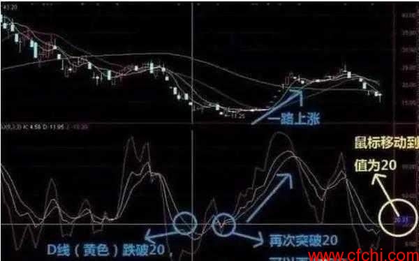 与此相同,当K线和D线在20以下向上交叉时,就属于一个胜算较高的短期买入信号;如果K线在50以下,由下往上连续两次击穿D线,形成右底比左底高的W底形态时,后市可能会出现较为强劲的涨幅。