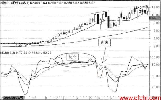 如果行情的走势过于强劲,并出现单边均衡的走势,KDJ指标就会出现钝化的现象。之所以出现这样的现象,是因为当行情出现单边均衡的走势时,KDJ指标的RSV值就会因为价格走势的波幅较小而倾向于波动走平,而不是向下或向上。所以,当行情缺少波动(波幅不大),且沿着一个方向不断上涨(下跌)的时候,KDJ指标中的RSV值达到极致之后就会在KDJ指标的高位(低位)做横向的震荡延伸,再加上KDJ指标中的K线是RSV值的加权平均线.D线是K线的加权平均线,J线又是3倍的K线减2倍的D线的差数(差离值),所以它们就会因此而出现相类似的反应,相互缠绕或粘连并沿着KDJ指标的顶部或底部作小幅的交错延伸。我们通常都会把KDJ指标的这一现象叫作“KDJ钝化”。
