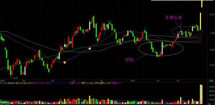 成交量的量柱形态决定了对应K线参考价值,重要的K线会发出重要的市场信号。本博客前面已经提到庄股起涨点关键位置的概念,在关键位置的关键K线出现后就是我们买入的时机。下面是两个图的说明。至于量柱K线理论内容可以看看我的图片集。我一向喜欢形象思维,记住一张图比记住一段文字来的容易和深刻。我相信大家关于股票的书看了不少,但是在实战的时候很难做到。因为从文字到图表到实战,反应延时过长。操盘要求的是反应速度。图中告诉我们该股票挖坑完毕、芙蓉出水、三次单阳不破。